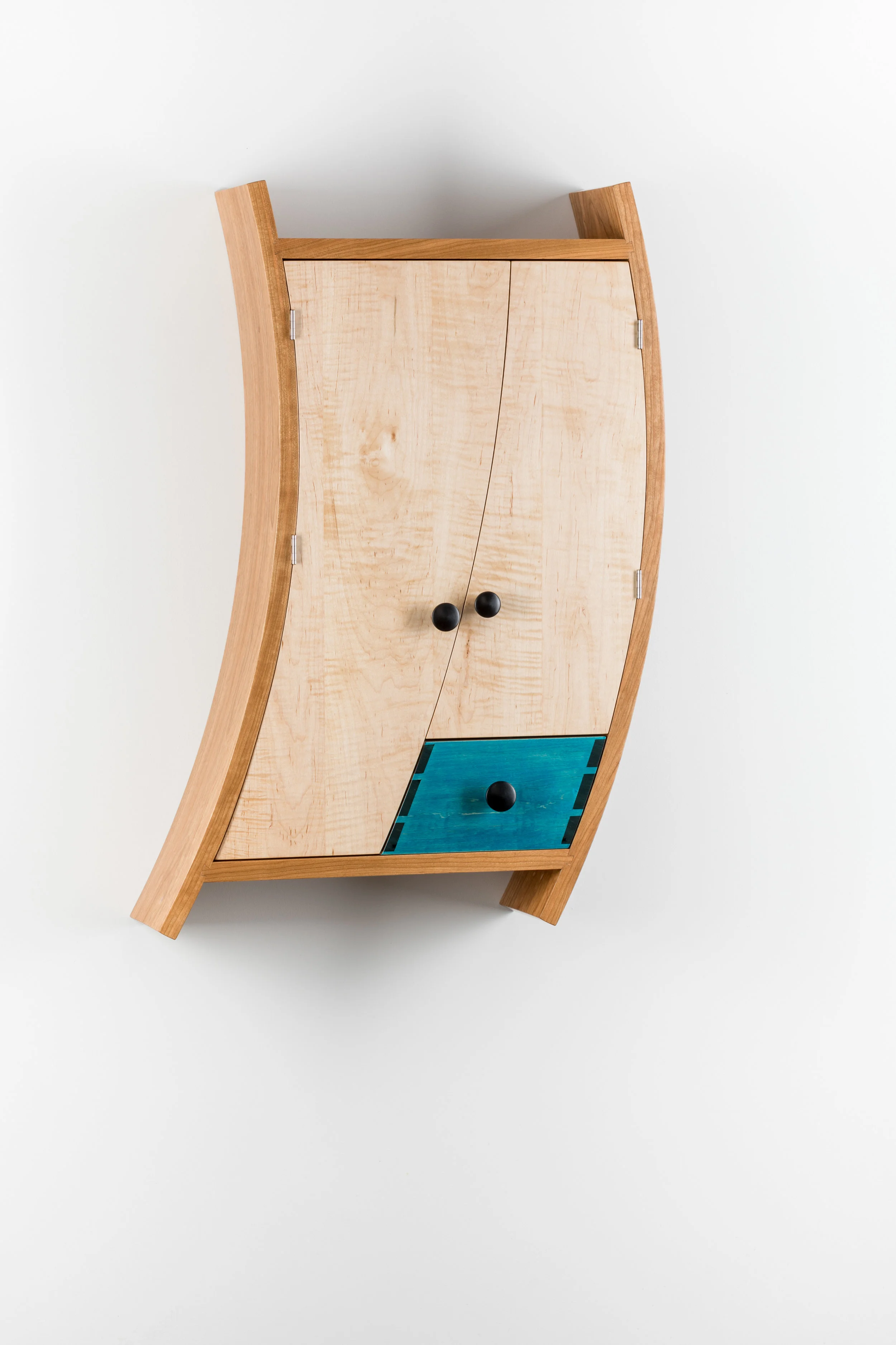 Cherry, curly maple, aniline dye, walnut, & ebony. 29"h x 19"w x 7"d. $3,900.00.